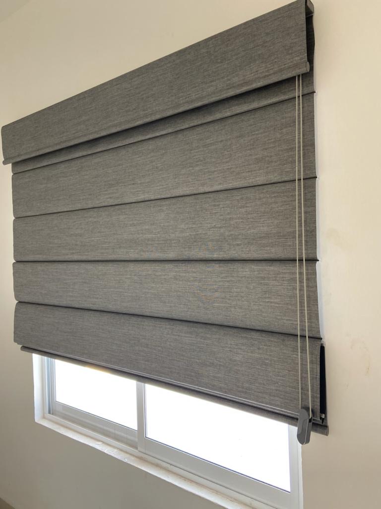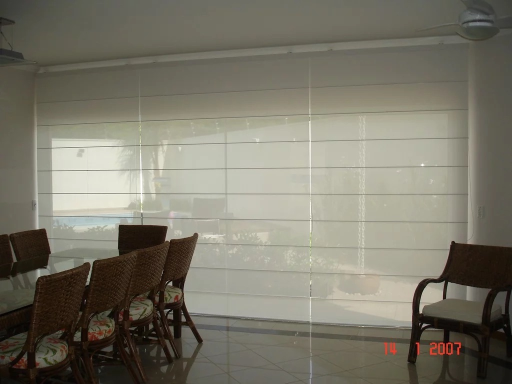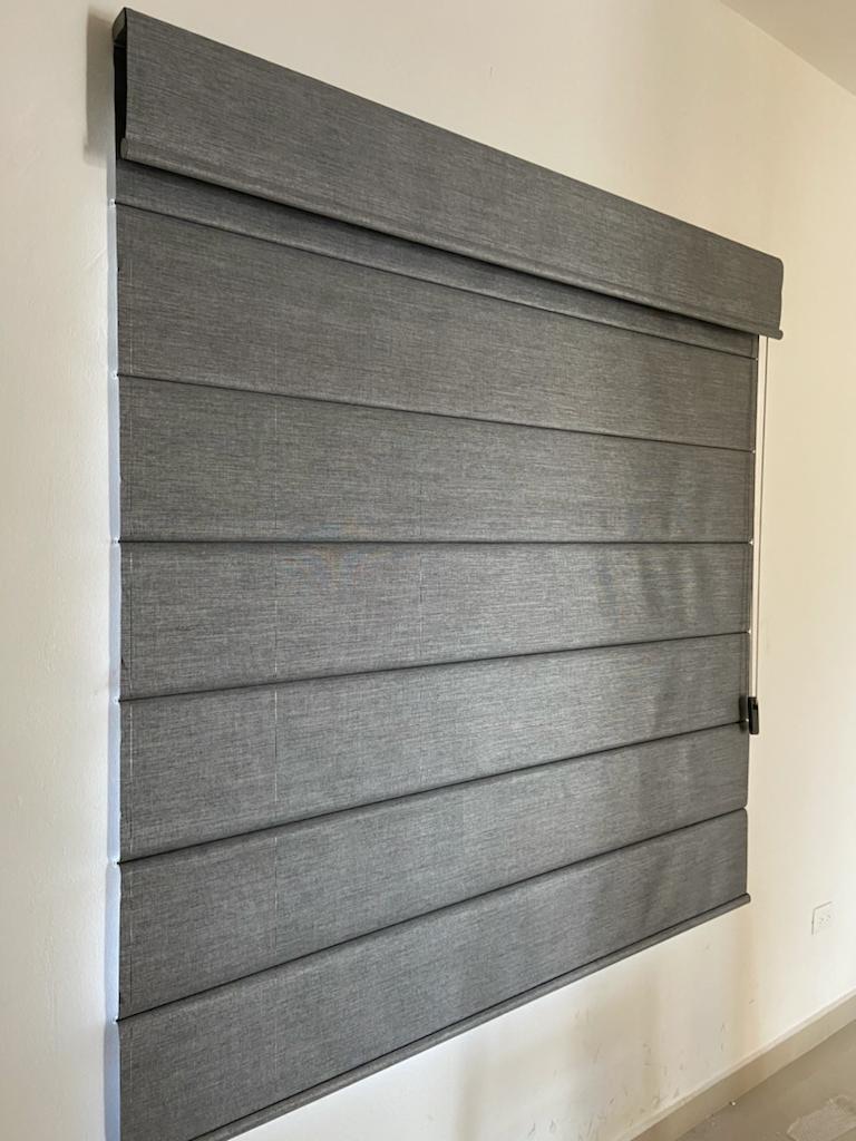 Persiana de funcionamiento vertical, por medio de pliegues que, al subir y bajar, estos se contraen o se traslapan. Con operación en base a un riel que hace que esta persiana tenga un estilo y diseño únicos.